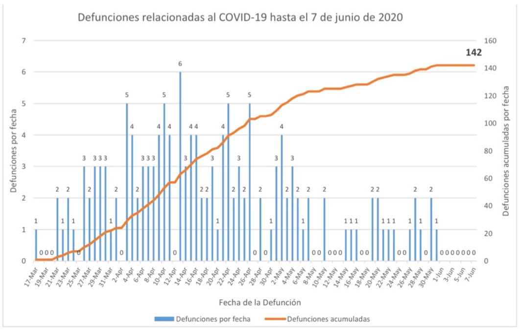 En estas gráficas de muertes se omitió la barra una muerte del 17 de marzo, registrada en muchísimas otras gráficas anteriores. Sin embargo las mismas gráficas las cuentan hacia el total de muertes acumuladas; es decir, las gráficas mismas exhibe el descuadre.