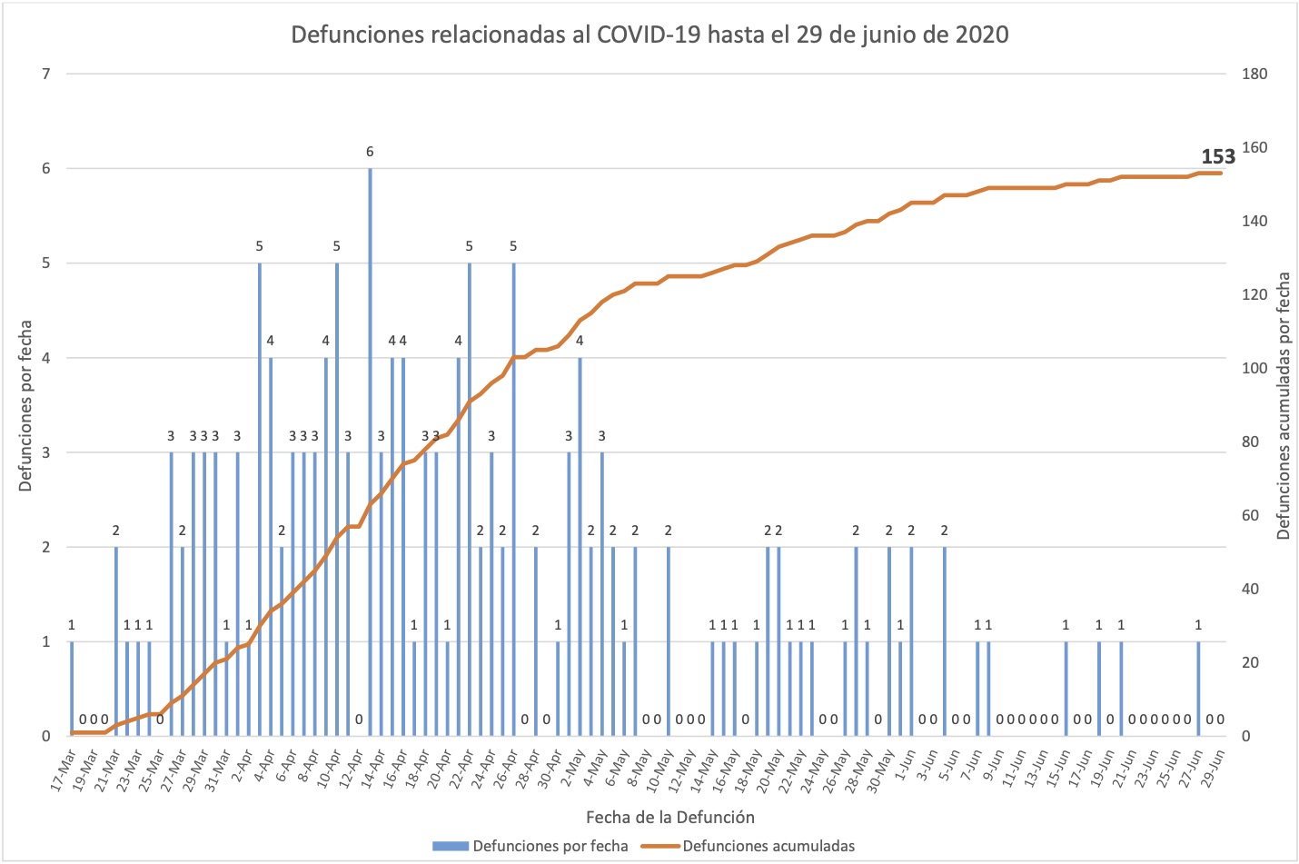 En estas gráficas de muertes se omitió la barra una muerte del 17 de marzo, registrada en muchísimas otras gráficas anteriores. Sin embargo las mismas gráficas las cuentan hacia el total de muertes acumuladas; es decir, las gráficas mismas exhibe el descuadre.