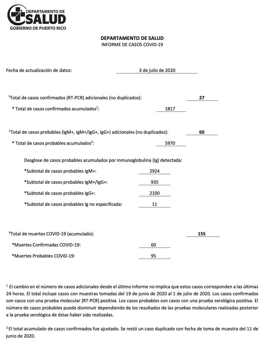 Advertencia: Favor notar que esta página usa las fechas que aparecen a la cabeza de los boletines del Departamento de Salud, pero estos suelen publicarse la mañana del próximo día, y muchas bases de datos y fuentes periodísticas reportan los mismos datos a base de la fecha de publicación.