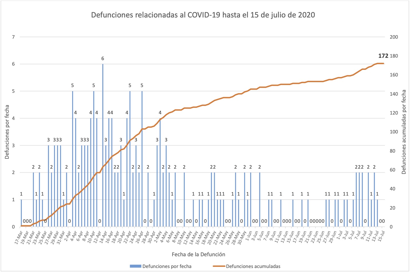 En estas gráficas de muertes se omitió la barra una muerte del 17 de marzo, registrada en muchísimas otras gráficas anteriores. Sin embargo las mismas gráficas las cuentan hacia el total de muertes acumuladas; es decir, las gráficas mismas exhibe el descuadre.