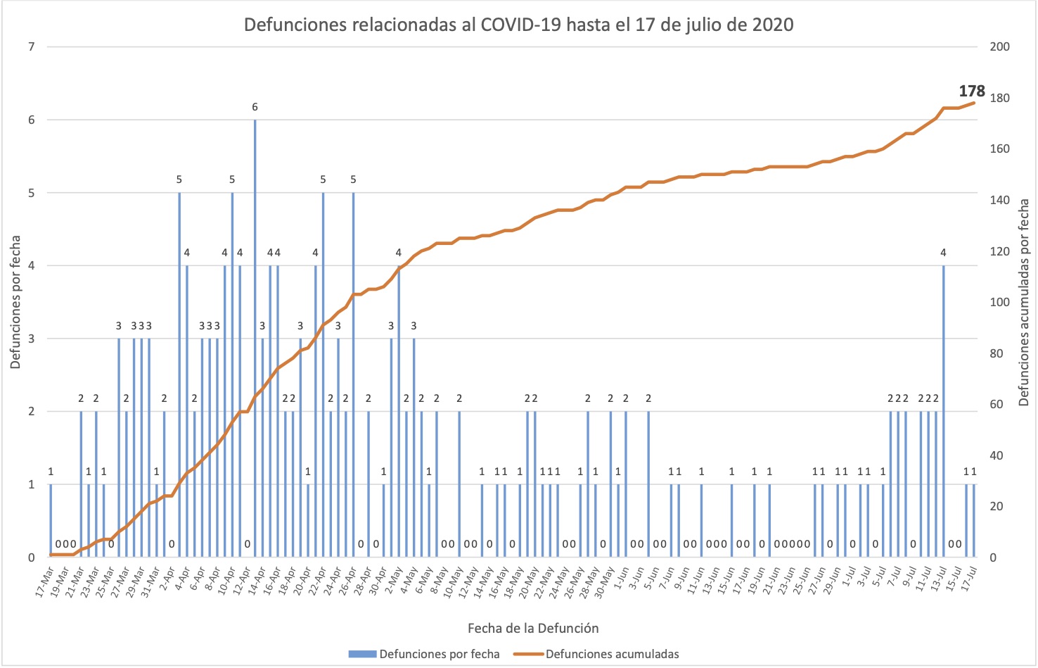 En estas gráficas de muertes se omitió la barra una muerte del 17 de marzo, registrada en muchísimas otras gráficas anteriores. Sin embargo las mismas gráficas las cuentan hacia el total de muertes acumuladas; es decir, las gráficas mismas exhibe el descuadre.