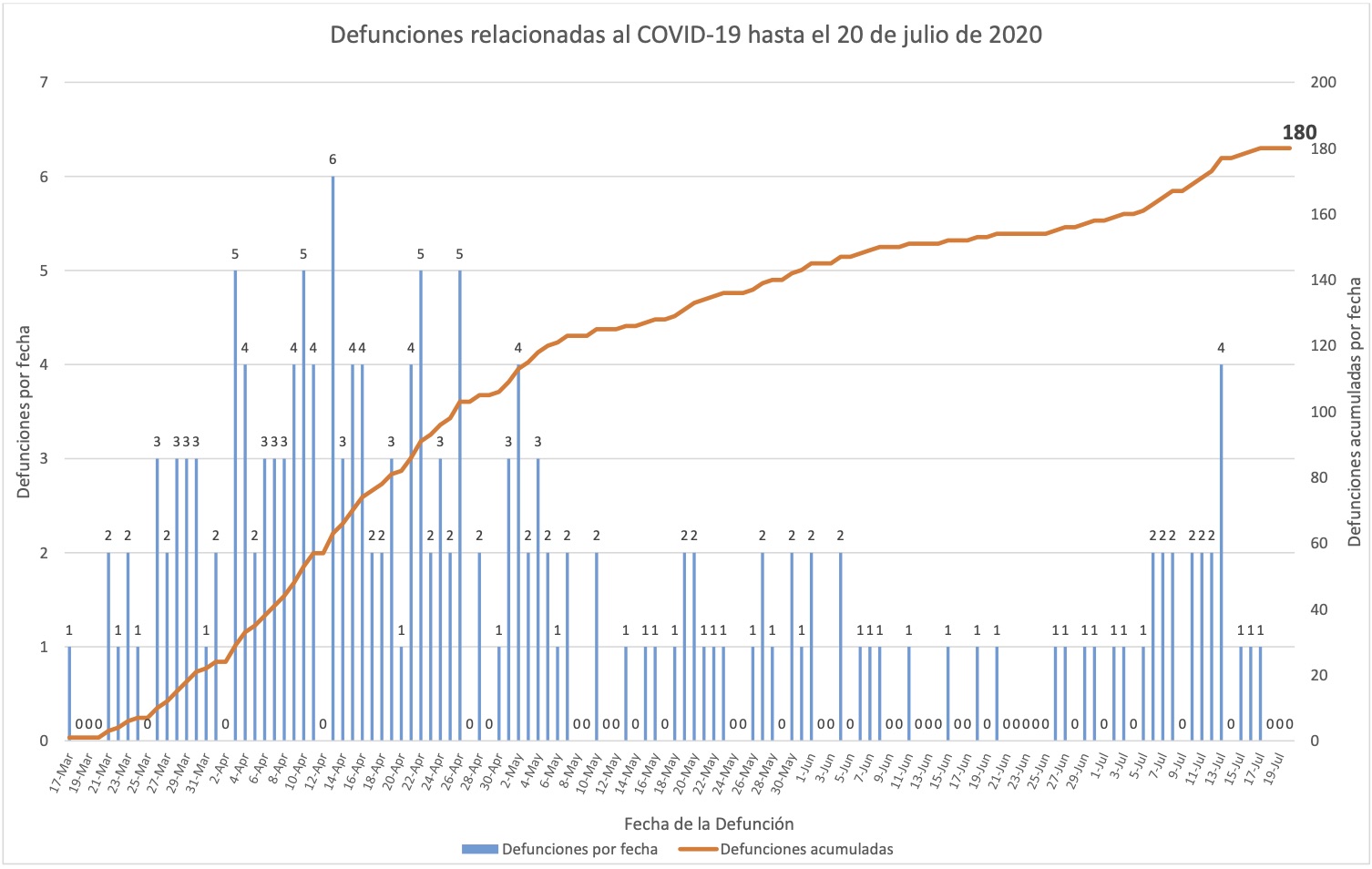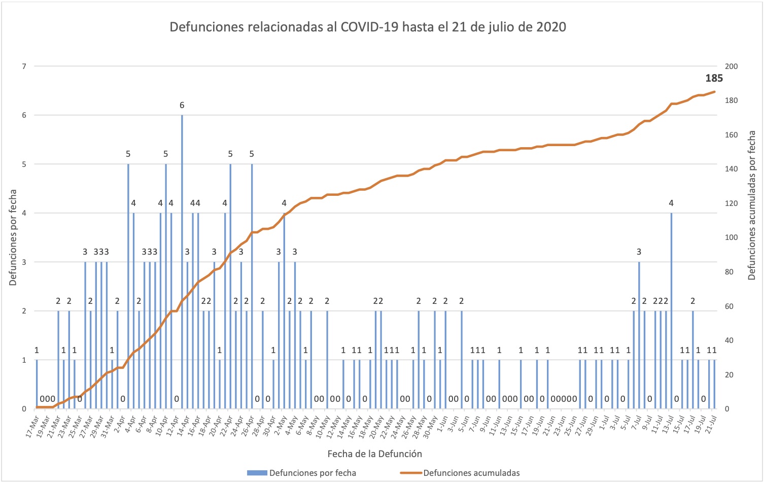 Advertencia: Favor notar que esta página usa las fechas que aparecen a la cabeza de los boletines del Departamento de Salud, pero estos suelen publicarse la mañana del próximo día, y muchas bases de datos y fuentes periodísticas reportan los mismos datos a base de la fecha de publicación.