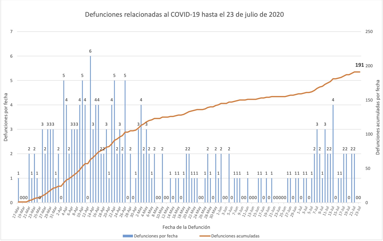 En estas gráficas de muertes se omitió la barra una muerte del 17 de marzo, registrada en muchísimas otras gráficas anteriores. Sin embargo las mismas gráficas las cuentan hacia el total de muertes acumuladas; es decir, las gráficas mismas exhibe el descuadre.