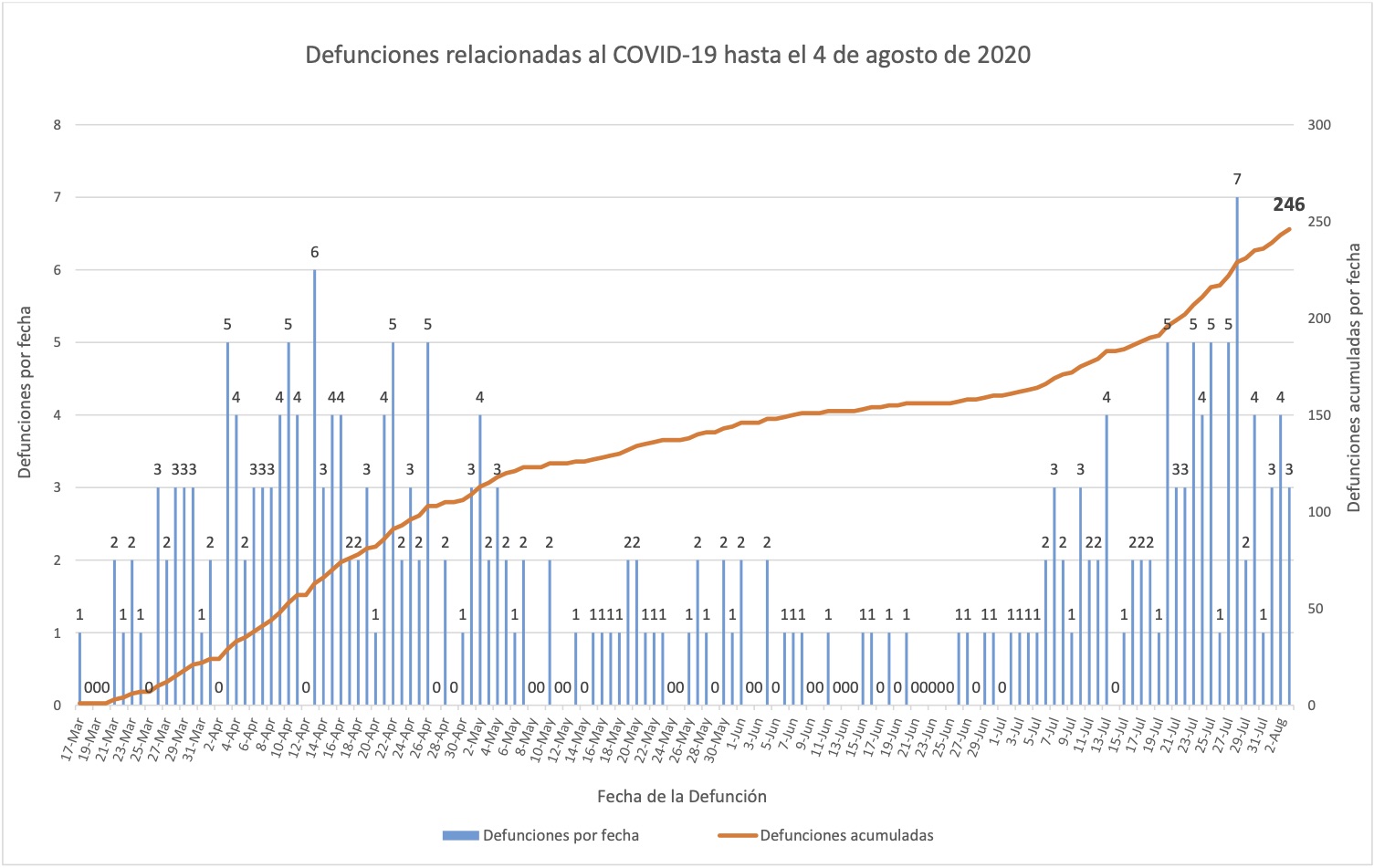 En estas gráficas de muertes se omitió la barra una muerte del 17 de marzo, registrada en muchísimas otras gráficas anteriores. Sin embargo las mismas gráficas las cuentan hacia el total de muertes acumuladas; es decir, las gráficas mismas exhibe el descuadre.