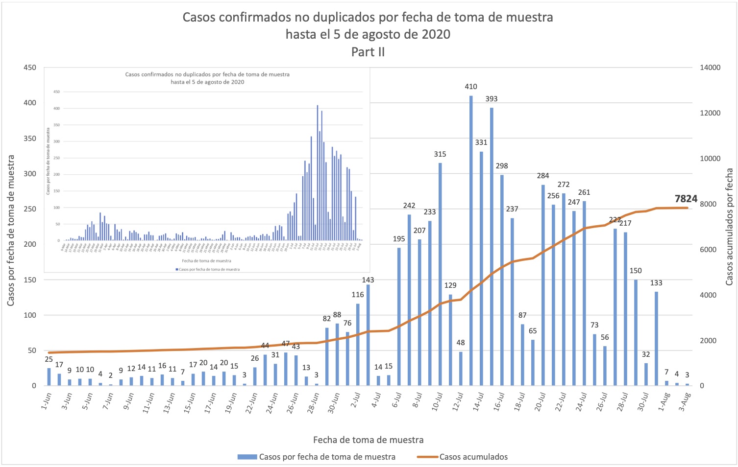 La forma de la curva superior se parece una gráfica de casos nuevos por fecha que se incorporan al conteo, pero alerta, no cuenta muchas restas de casos al conteo (porque las restas dañan los estimados de rezagos, hacen que den negativo). Por esto la curva es en realidad más alta que los números verdaderos de casos confirmados.