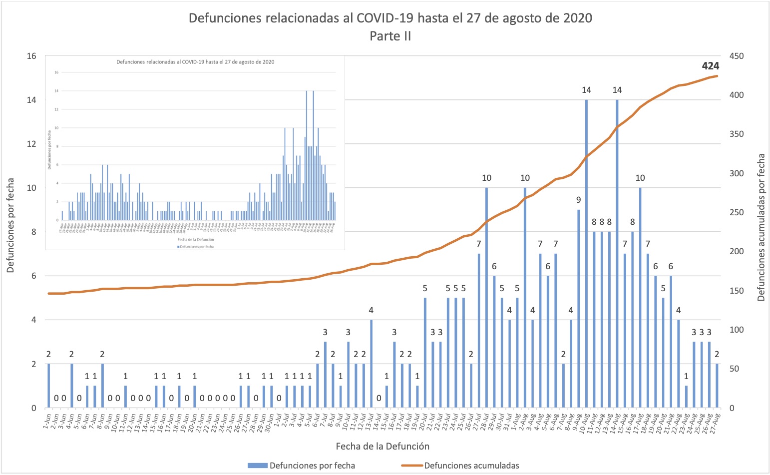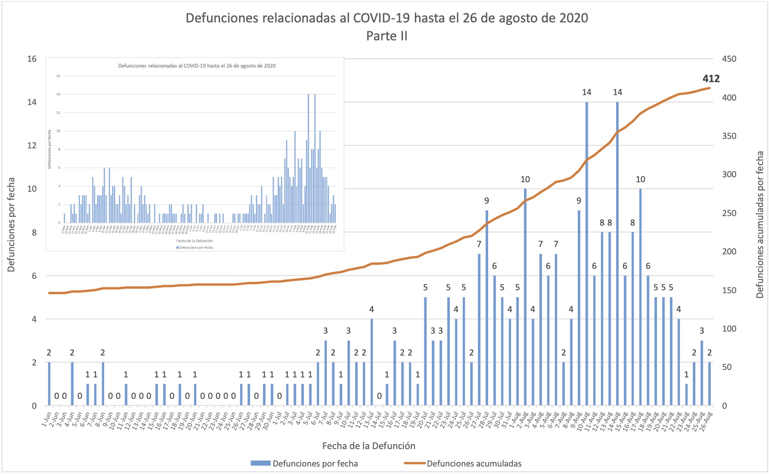 Advertencia: Favor notar que esta página usa las fechas que aparecen a la cabeza de los boletines del Departamento de Salud, pero estos suelen publicarse la mañana del próximo día, y muchas bases de datos y fuentes periodísticas reportan los mismos datos a base de la fecha de publicación.