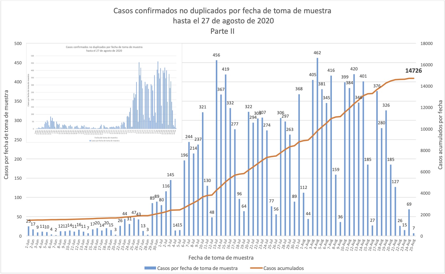 La forma de la curva superior se parece una gráfica de casos nuevos por fecha que se incorporan al conteo, pero alerta, no cuenta muchas restas de casos al conteo (porque las restas dañan los estimados de rezagos, hacen que den negativo). Por esto la curva es en realidad más alta que los números verdaderos de casos confirmados.