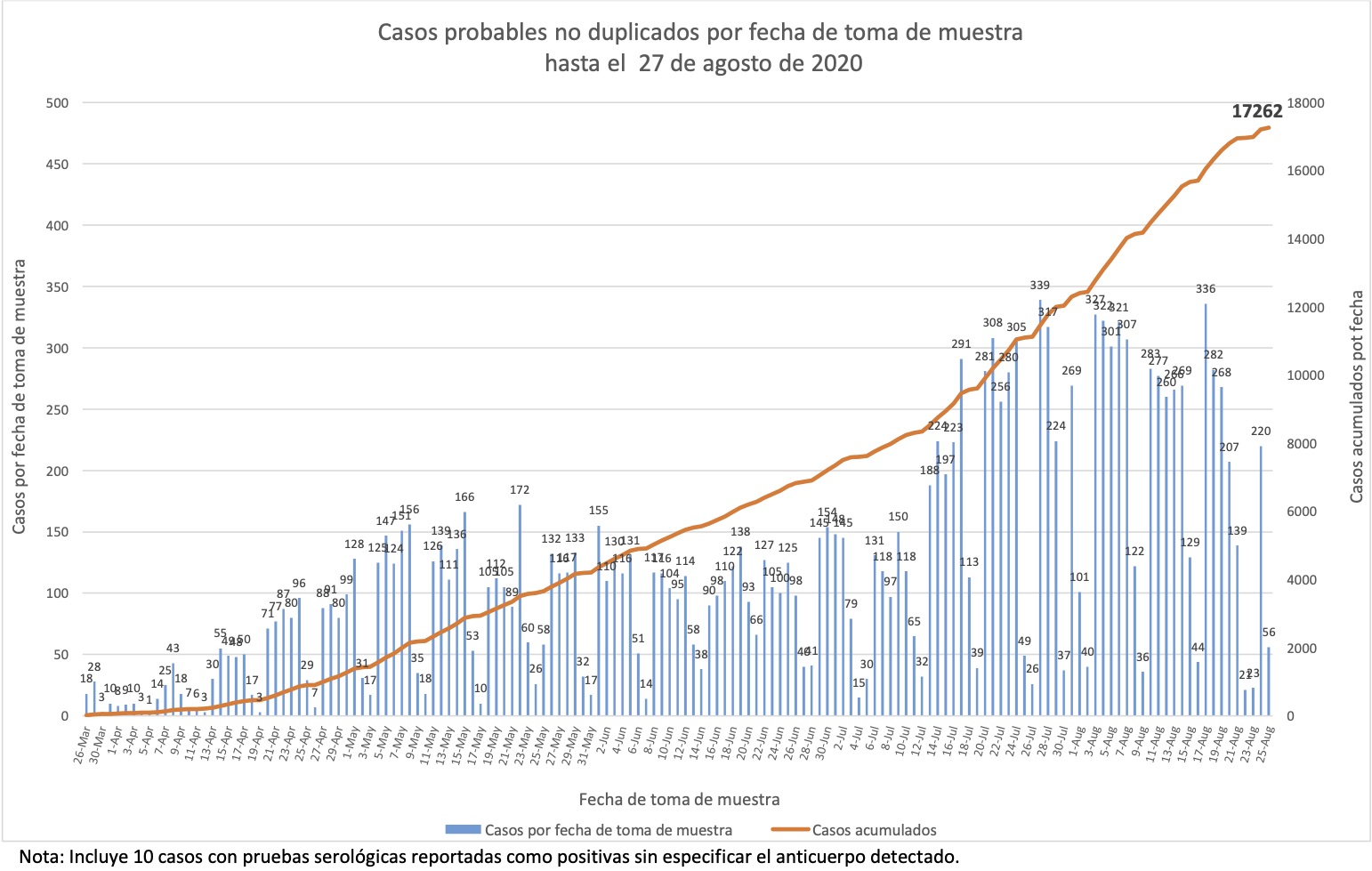 Nótese que esto es por fecha de boletín, no de muestra, y que por lo tanto esta gráfica nos dice cuándo se detectaron los casos, no cuándo sucedieron.