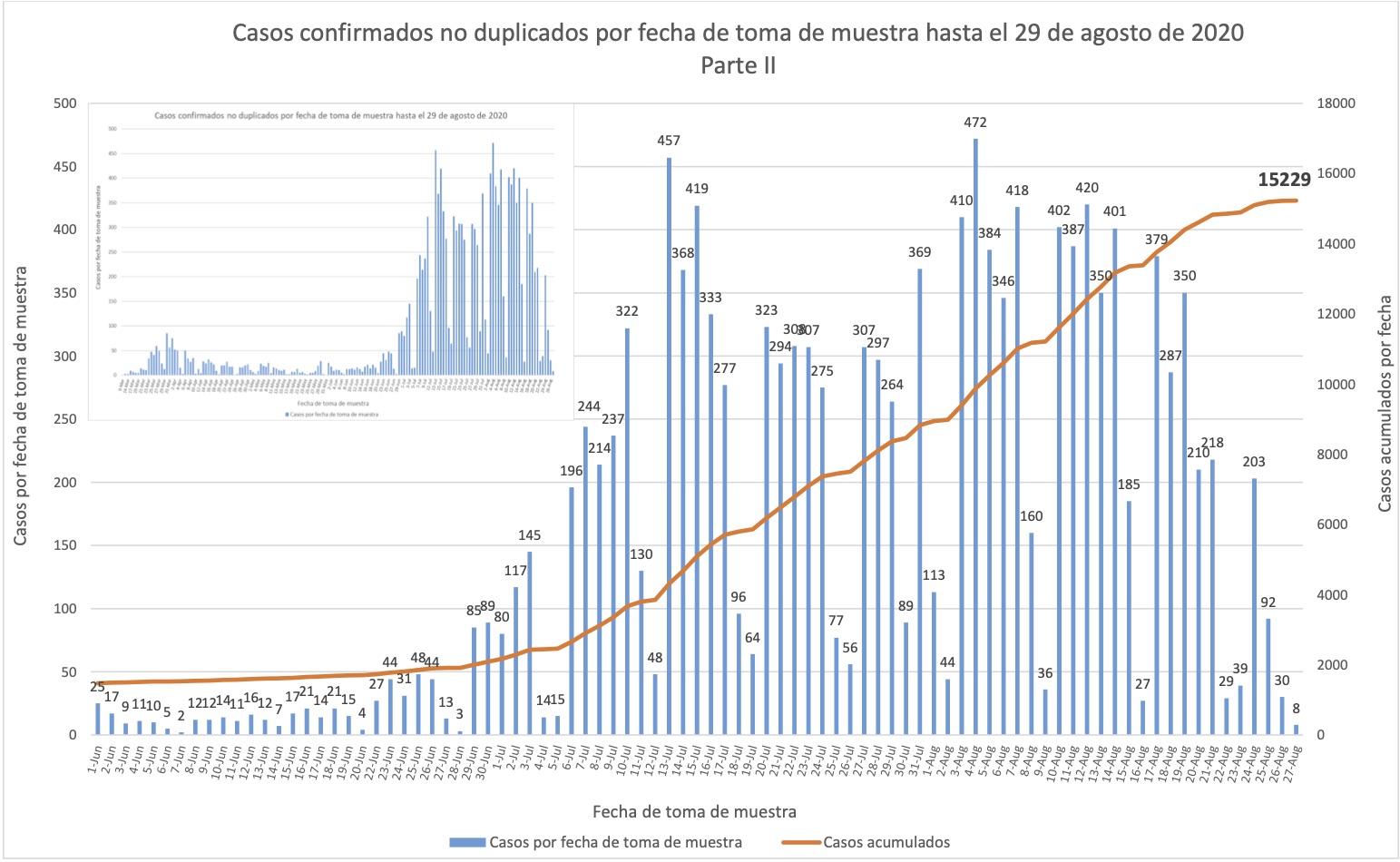La forma de la curva superior se parece una gráfica de casos nuevos por fecha que se incorporan al conteo, pero alerta, no cuenta muchas restas de casos al conteo (porque las restas dañan los estimados de rezagos, hacen que den negativo). Por esto la curva es en realidad más alta que los números verdaderos de casos confirmados.