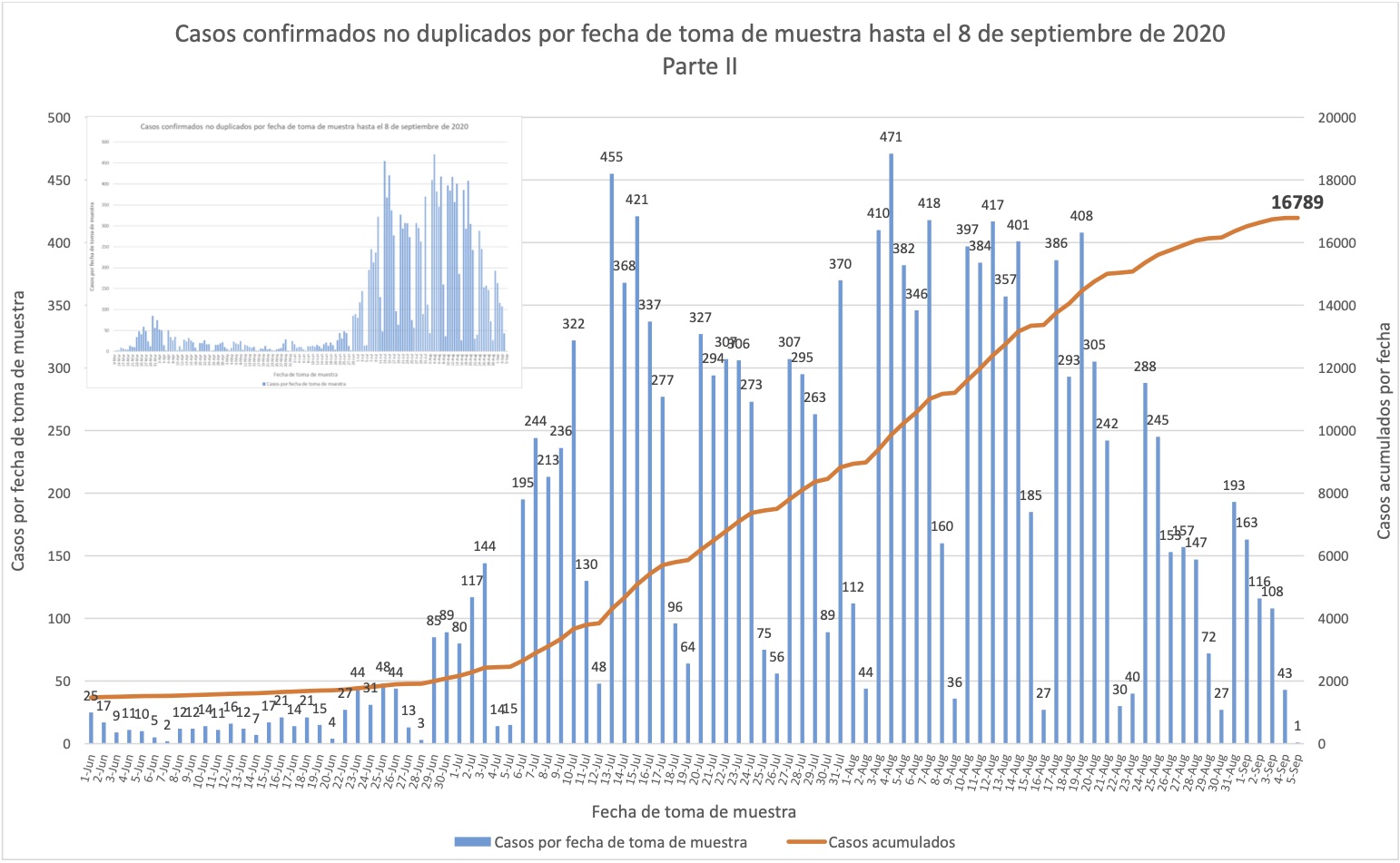 La forma de la curva superior se parece una gráfica de casos nuevos por fecha que se incorporan al conteo, pero alerta, no cuenta muchas restas de casos al conteo (porque las restas dañan los estimados de rezagos, hacen que den negativo). Por esto la curva es en realidad más alta que los números verdaderos de casos confirmados.