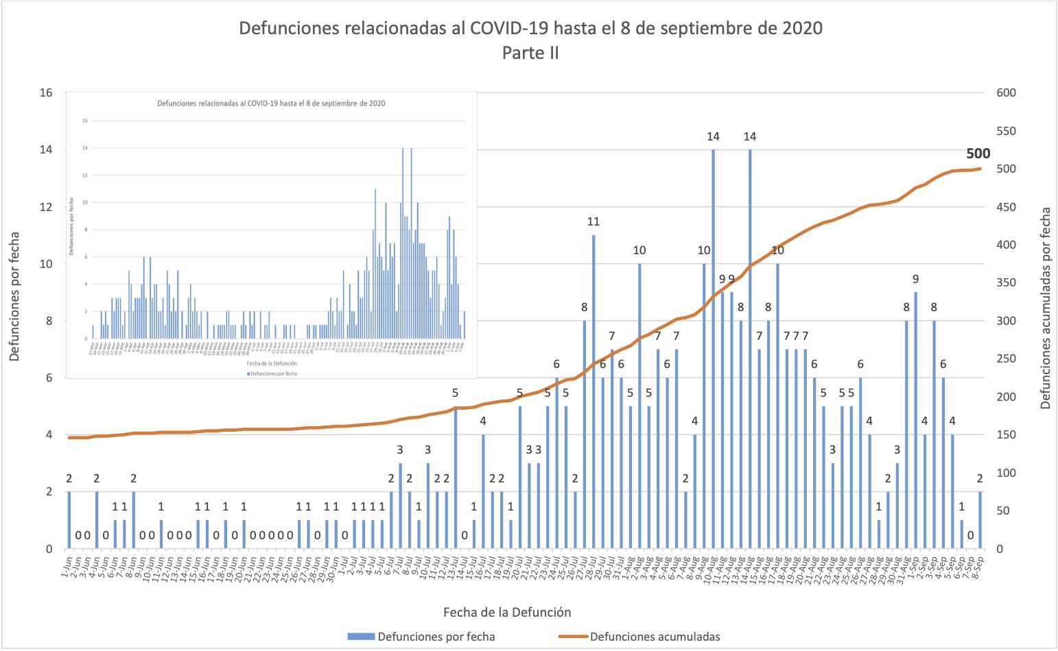 En estas gráficas de muertes se omitió la barra una muerte del 28 de septiembre, que sí se detalla en la nota al calce 5 al principio del informe. Sin embargo la misma gráfica la cuentan hacia el total de 654 muertes acumuladas; es decir, la gráfica misma exhibe el descuadre.