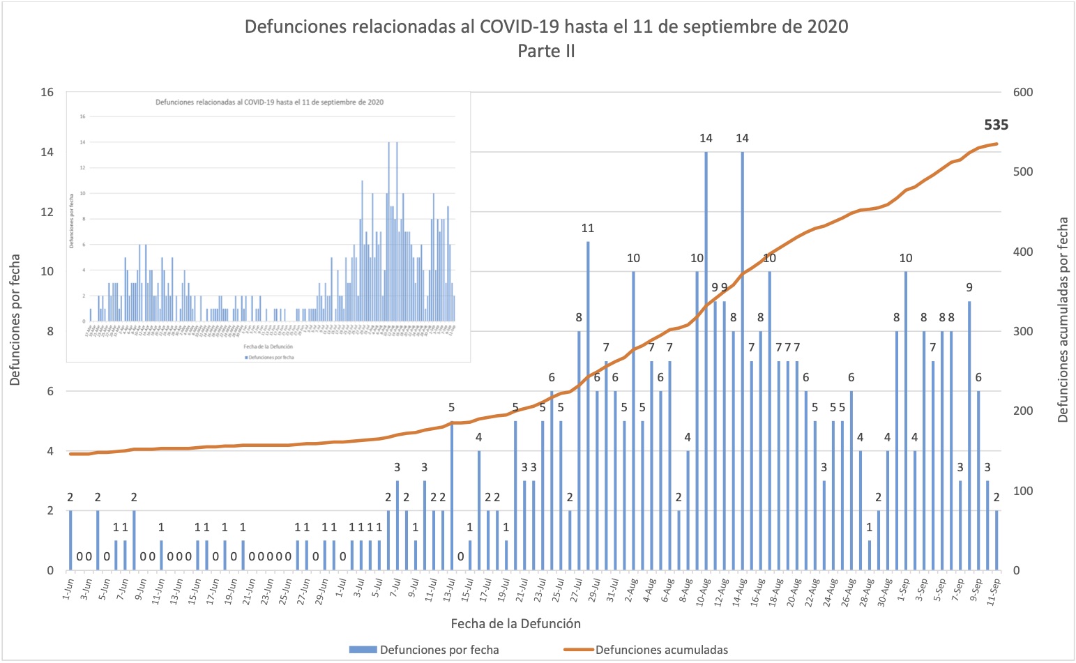 En estas gráficas de muertes se omitió la barra una muerte del 28 de septiembre, que sí se detalla en la nota al calce 5 al principio del informe. Sin embargo la misma gráfica la cuentan hacia el total de 654 muertes acumuladas; es decir, la gráfica misma exhibe el descuadre.