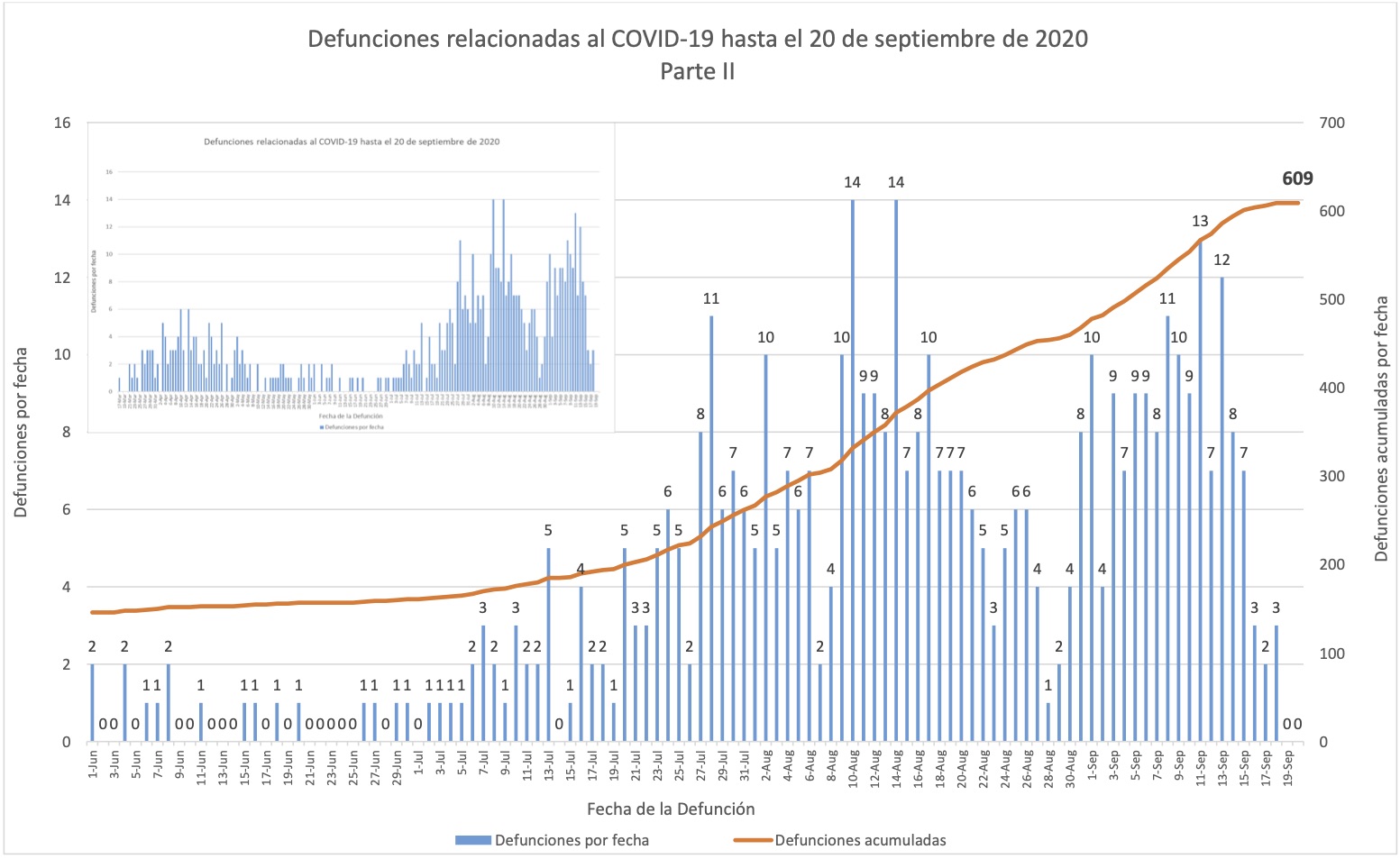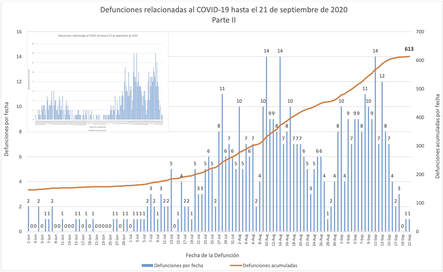 En estas gráficas de muertes se omitió la barra una muerte del 28 de septiembre, que sí se detalla en la nota al calce 5 al principio del informe. Sin embargo la misma gráfica la cuentan hacia el total de 654 muertes acumuladas; es decir, la gráfica misma exhibe el descuadre.
