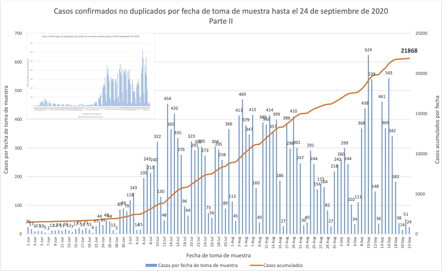 Advertencia: Favor notar que esta página usa las fechas que aparecen a la cabeza de los boletines del Departamento de Salud, pero estos suelen publicarse la mañana del próximo día, y muchas bases de datos y fuentes periodísticas reportan los mismos datos a base de la fecha de publicación.