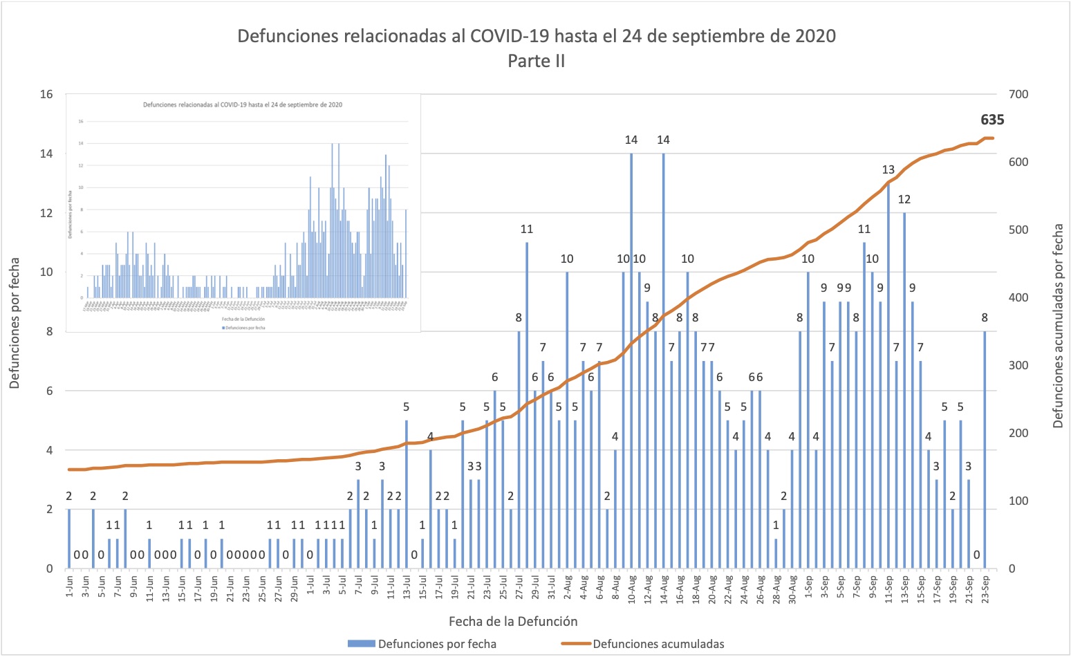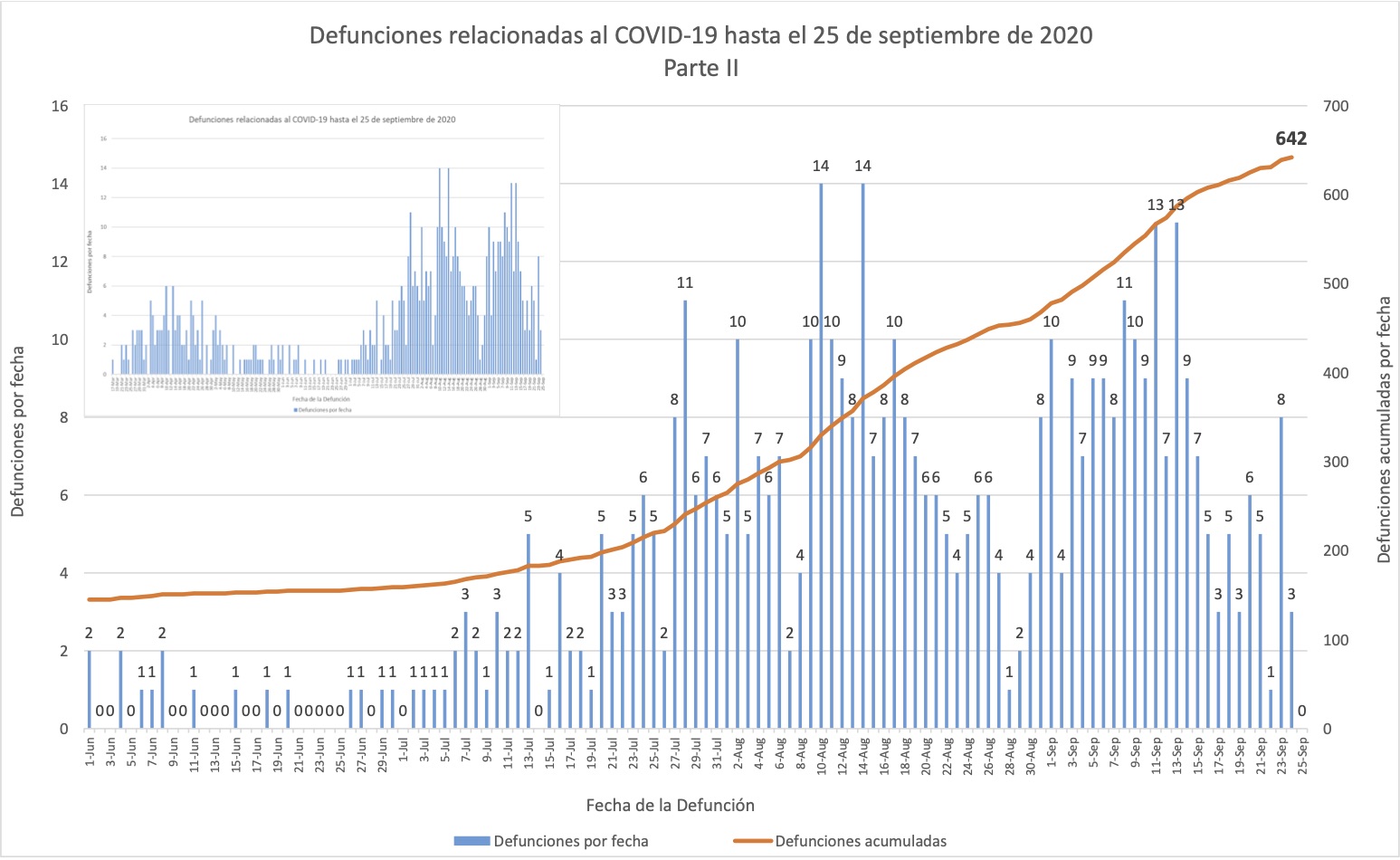 En estas gráficas de muertes se omitió la barra una muerte del 28 de septiembre, que sí se detalla en la nota al calce 5 al principio del informe. Sin embargo la misma gráfica la cuentan hacia el total de 654 muertes acumuladas; es decir, la gráfica misma exhibe el descuadre.
